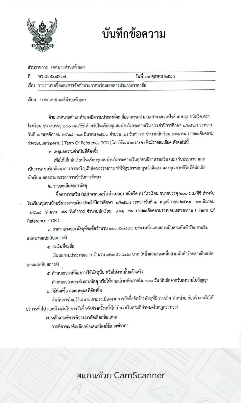 รายงานขอซื้อและการจัดทำประกาศพร้อมเอกสารประกวดราคาซื้อ ซื้ออาหารเสริม (นม) พาสเจอร์ไรส์ แบบถุง ชนิดจืด ตราโรงเรียน ขนาดบรรจุ ๒๐๐ มล./ซีซี สำหรับโรงเรียนชุมชนบ้านวังกระดาษเงิน ประจำปีการศึกษา ๒/๒๕๖๘ ระหว่างวันที่ ๑ พฤศจิกายน ๒๕๖๘ - ๑๓ มีนาคม ๒๕๖๙ จำนวน ๘๘