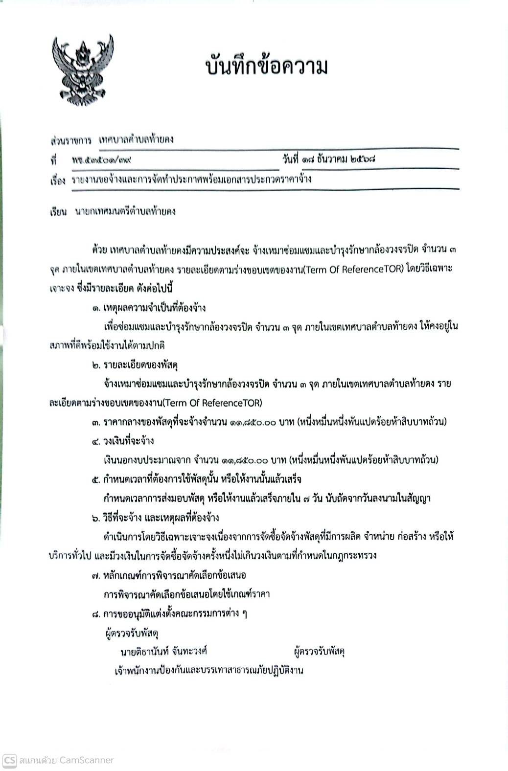 รายงานขอซื้อและการจัดทำประกาศพร้อมเอกสารประกวดราคาซื้อ จ้างเหมาซ่อมแซมและบำรุงรักษากล้องวงจรปิด จำนวน 3 จุด ภายในเขตเทศบาลตำบลท้ายดง รายละเอียดตามร่างขอบเขตของงาน (Term Of Reference :TOR)