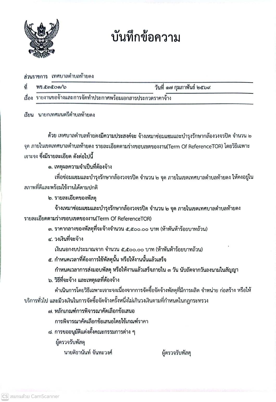 รายงานขอซื้อและการจัดทำประกาศพร้อมเอกสารประกวดราคาซื้อ จ้างเหมาซ่อมแซมและบำรุงรักษากล้องวงจรปิด จำนวน 2 จุด ภายในเขตเทศบาลตำบลท้ายดง รายละเอียดตามร่างขอบเขตของงาน (Term Of Reference :TOR)