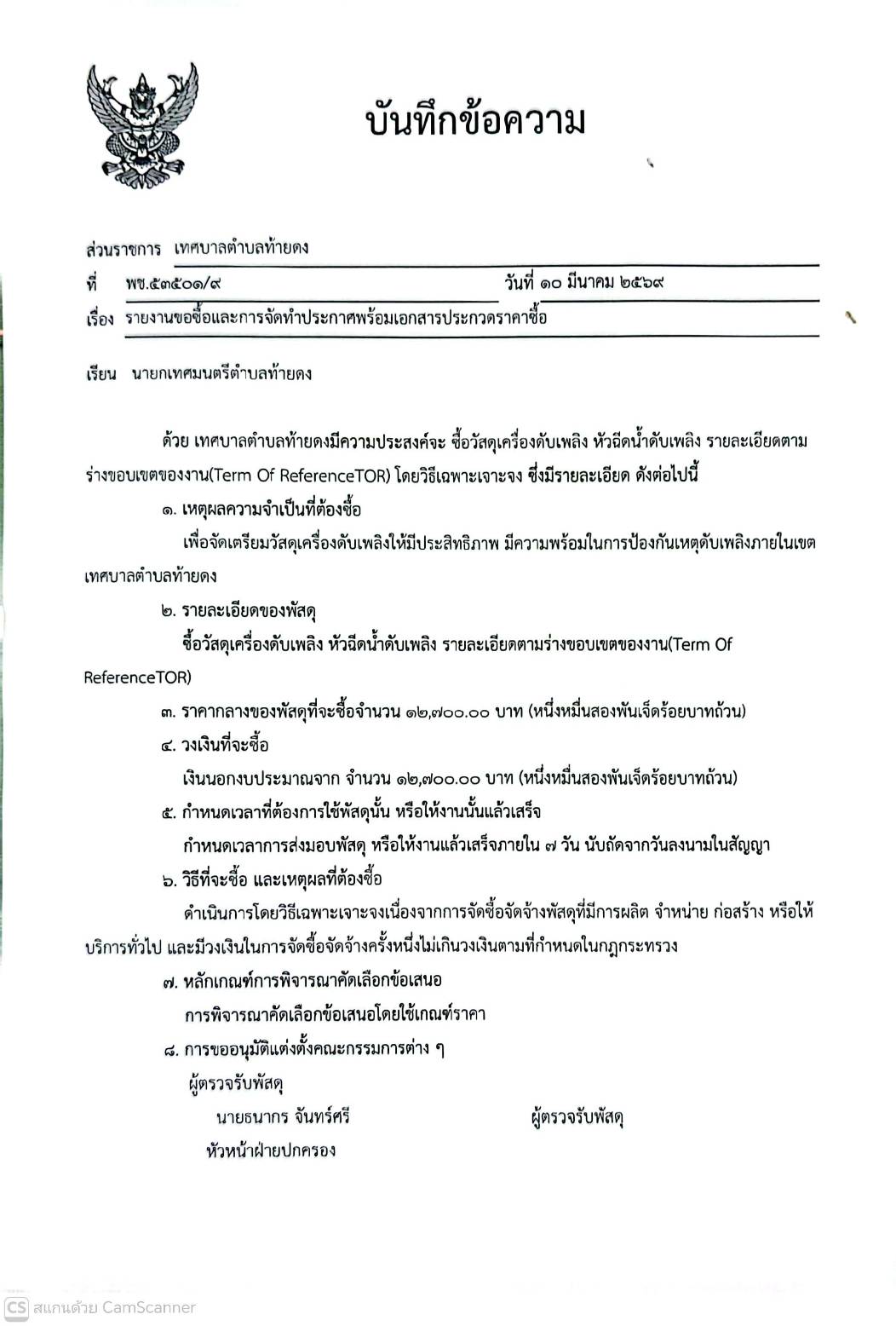 รายงานขอซื้อและการจัดทำประกาศพร้อมเอกสารประกวดราคาซื้อ จัดซื้อวัสดุเครื่องดับเพลิง หัวฉีดน้ำดับเพลิง