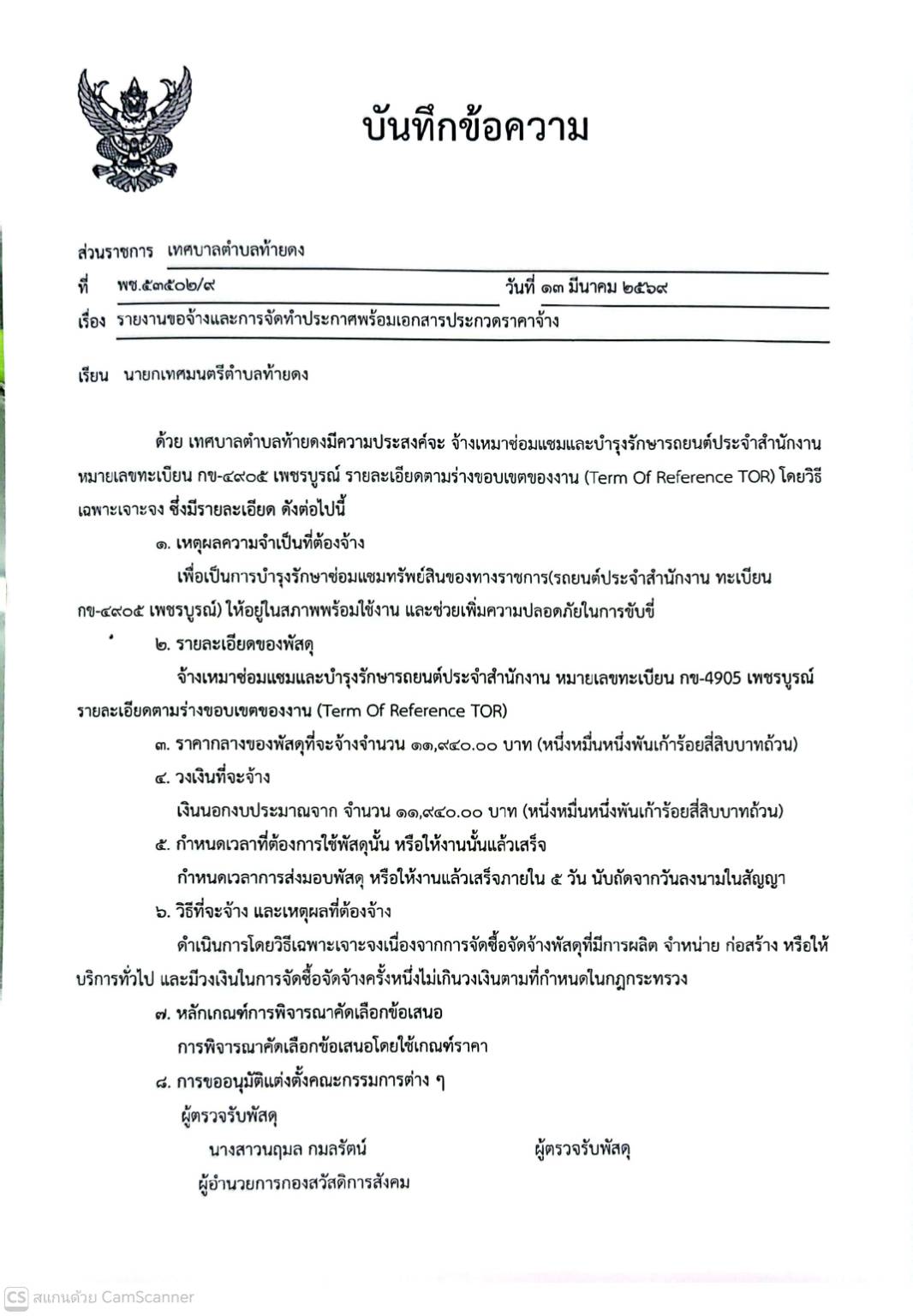 รายงานขอจ้างและการจัดทำประกาศพร้อมเอกสารประกวดราคาจ้าง จ้างเหมาซ่อมแซมและบำรุงรักษารถยนต์ประจำสำนักงาน หมายเลขทะเบียน กข-4905 เพชรบูรณ์
