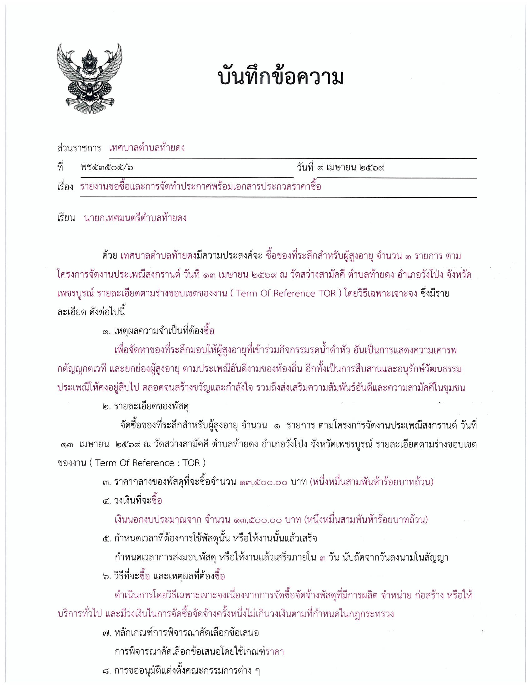 รายงานขอซื้อและการจัดทำประกาศพร้อมเอกสารประกวดราคาซื้อของที่ระลึกสำหรับผู้สูงอายุ จำนวน 1 รายการ ตามโครงการจัดงานประเพณีสงกรานต์ วันที่ 13 เมษายน 2569 ณ วัดสว่างสามัคคี