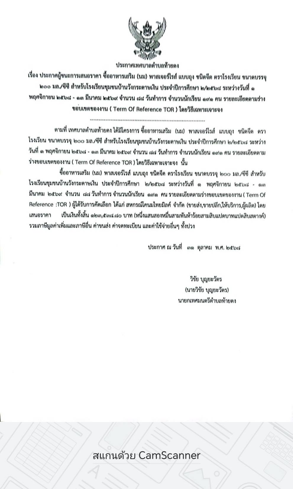 ประกาศผู้ชนะการเสนอราคา ซื้ออาหารเสริม (นม) พาสเจอร์ไรส์ แบบถุง ชนิดจืด ตราโรงเรียน ขนาดบรรจุ ๒๐๐ มล./ซีซี สำหรับโรงเรียนชุมชนบ้านวังกระดาษเงิน ประจำปีการศึกษา ๒/๒๕๖๘ ระหว่างวันที่ ๑ พฤศจิกายน ๒๕๖๘ - ๑๓ มีนาคม ๒๕๖๙ จำนวน ๘๘ วันทำการ จำนวนนักเรียน ๑๙๑ คน ร