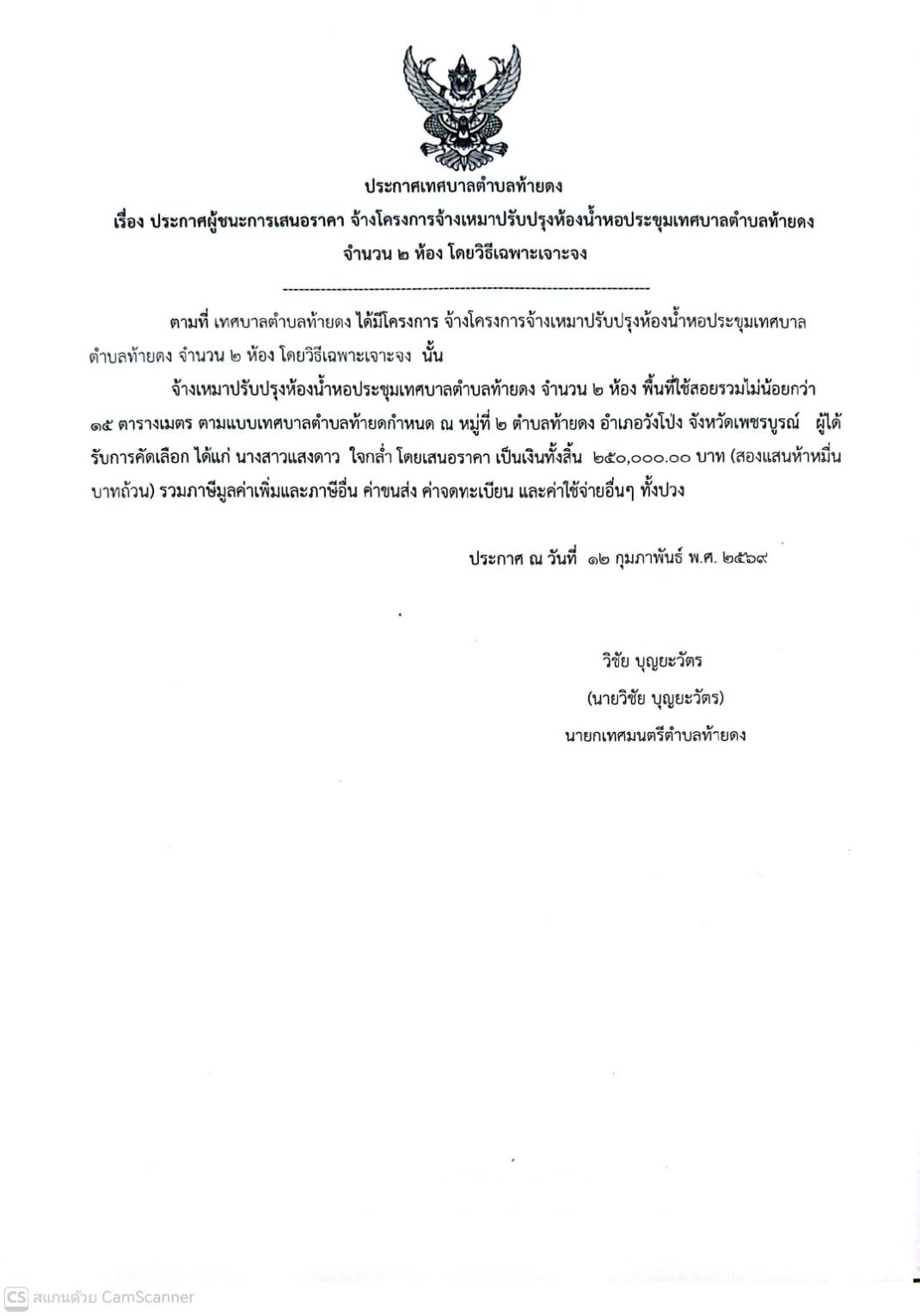 ประกาศผู้ชนะการเสนอราคา จ้างเหมาปรับปรุงห้องน้ำหอประชุมเทศบาลตำบลท้ายดง จำนวน 2 ห้อง พื้นที่ใช้สอยรวมไม่น้อยกว่า 15 ตารางเมตร