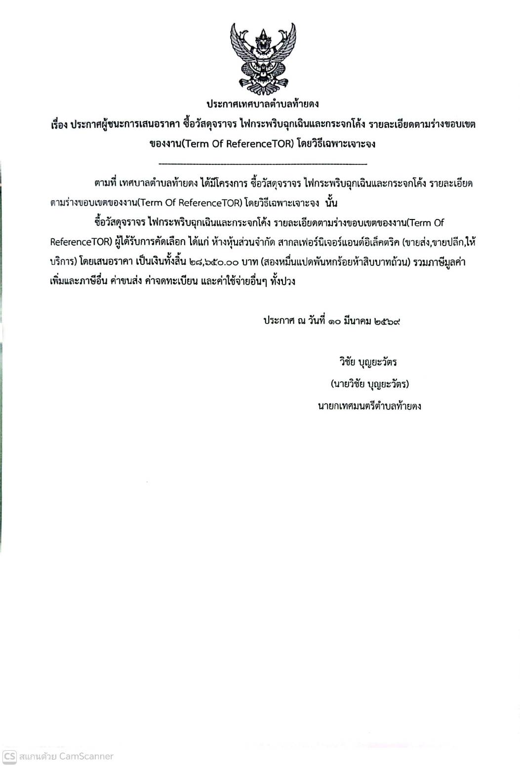 ประกาศผู้ชนะราคา ประจำปีงบประมาณ 2569