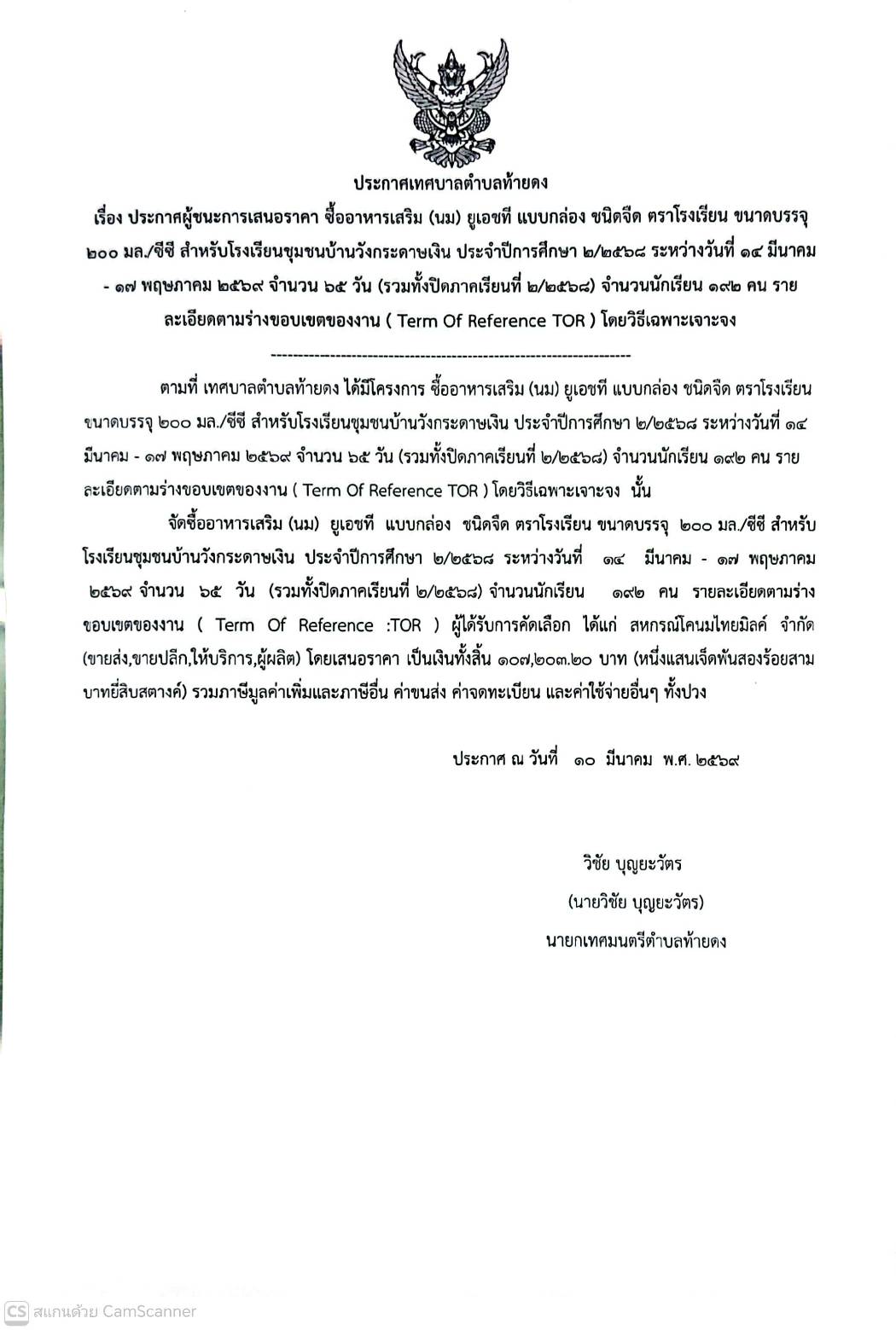 ประกาศผู้ชนะการเสนอราคา จัดซื้ออาหารเสริม(นม) ยูเอชที แบบกล่อง ชนิดจืด ตราโรงเรียน ขนาดบรรจุ 200 มล./ซีซี สำหรับโรงเรียนชุมชนบ้านวังกระดาษเงิน ประจำปีการศึกษาที่ 2/2568 ระหว่างวันที่ 14 มีนาคม - 17 พฤษภาคม 2569 จำนวน 65 วัน (รวมทั้งปิดภาคเรียนที่ 2/2568)