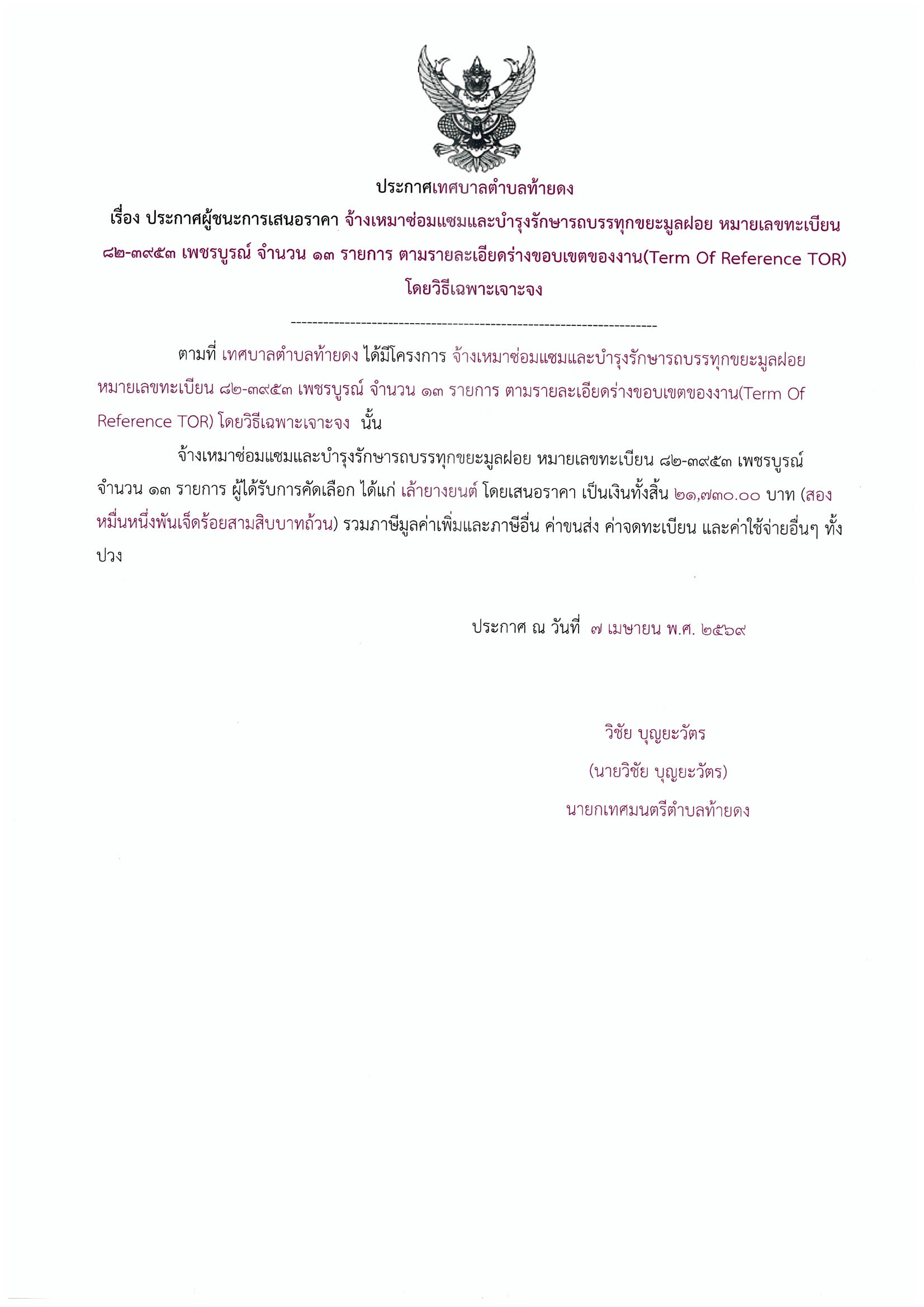 ประกาศผู้ชนะการเสนอราคา จ้างเหมาซ่อมแซมและบำรุงรักษารถบรรทุกขยะมูลฝอย หมายเลขทะเบียน 82-3953 เพชรบูรณ์