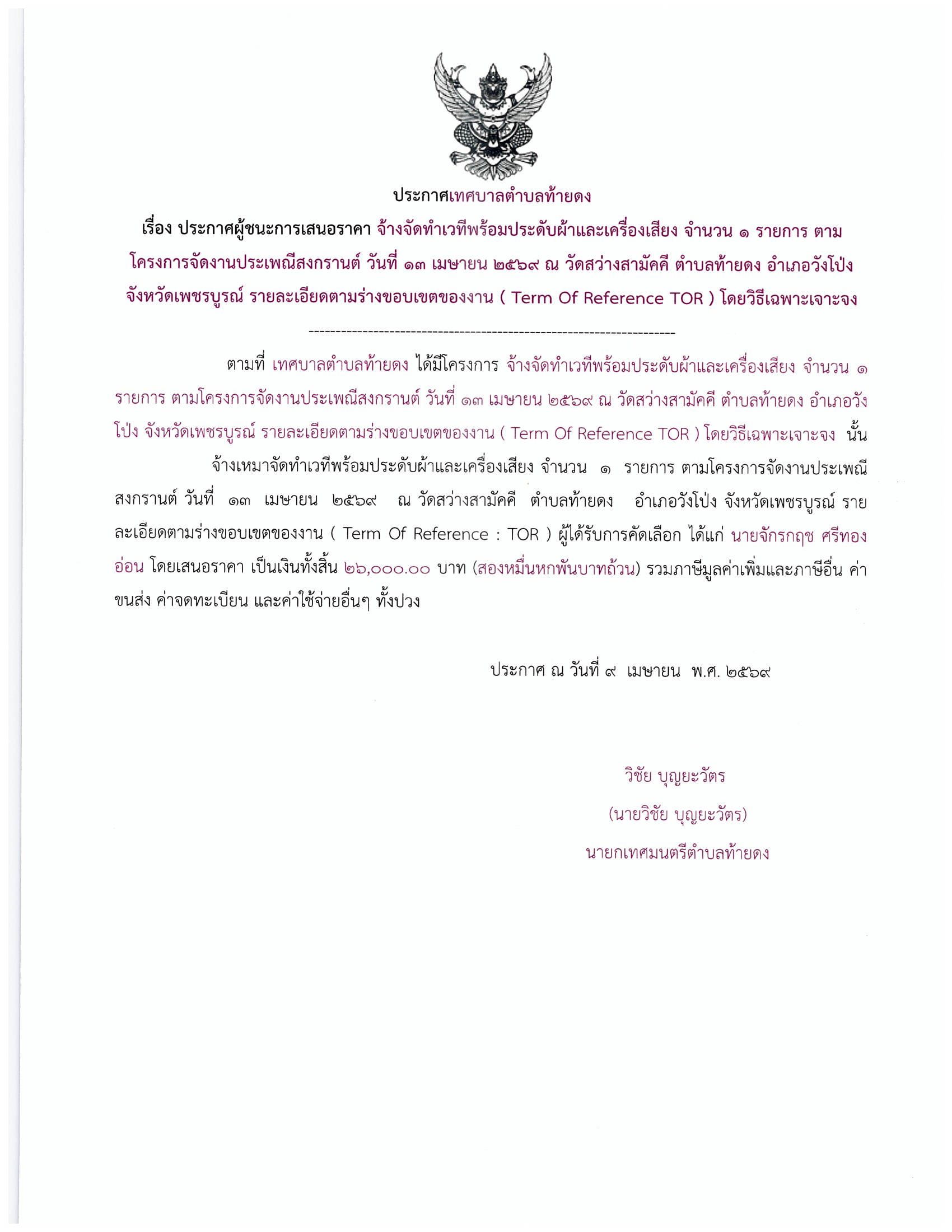 ประกาศผู้ชนะการเสนอราคา จ้างจัดทำเวทีพร้อมประดับผ้าและเครื่องเสียง จำนวน 1 รายการ ตามโครงการจัดงานประเพณีสงกรานต์ วันที่ 13 เมษายน 2569 ณ วัดสว่างสามัคคี