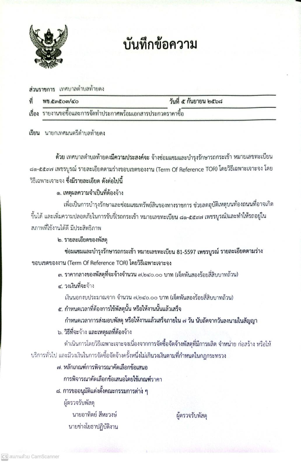 รายงานขอซื้อและการจัดทำประกาศพร้อมเอกสารประกวดราคาซื้อ จ้างเหมาซ่อมแซมและบำรุงรัษารถกระเช้า หมายเลขทะเบียน 81-5597 เพชรบูรณ์ รายละเอียดตามร่างขอบเขตของงาน (Term Of Reference :TOR)