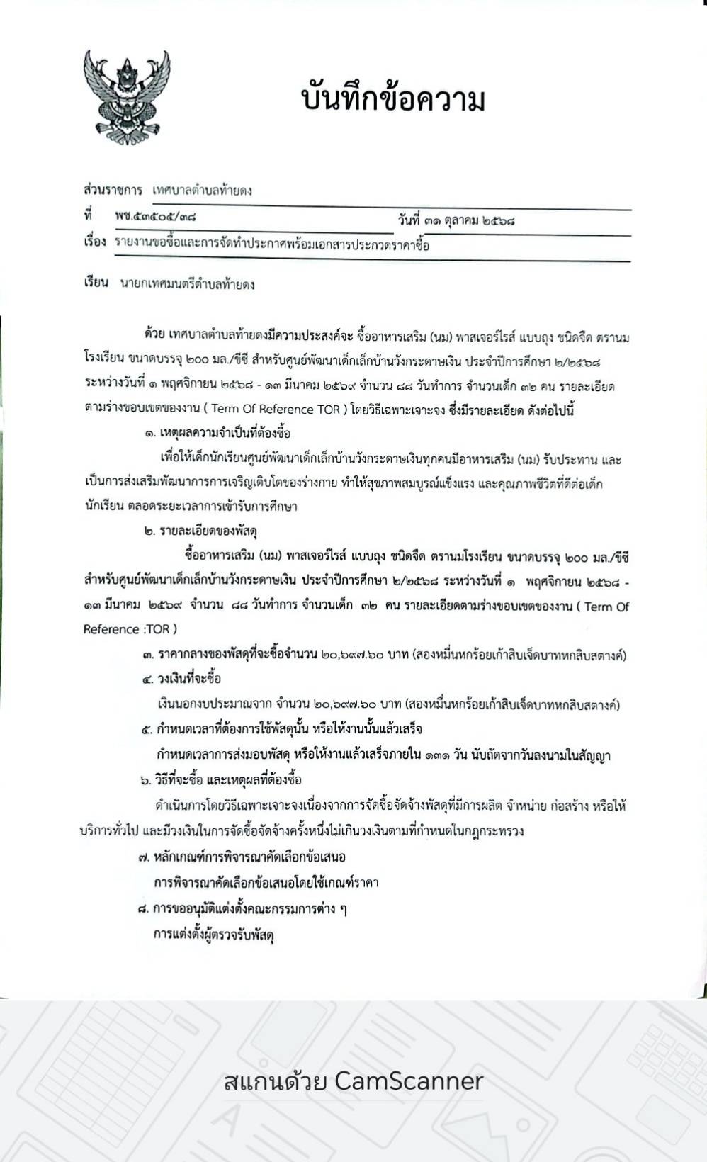 รายงานขอซื้อและการจัดทำประกาศพร้อมเอกสารประกวดราคาซื้อ ซื้ออาหารเสริม (นม) พาสเจอร์ไรส์ แบบถุง ชนิดจืด ตรานมโรงเรียน ขนาดบรรจุ ๒oo มล./ขีซี สำหรับศูนย์พัฒนาเด็กเล็กบ้านวังกระดาษเงิน ประจำปีการศึกษา ๒/๒๕๖๘ ระหว่างวันที่ ๑ พฤศจิกายน ๒๕๖๘ - ๑๓ มีนาคม ๒๕๖๙ จำ