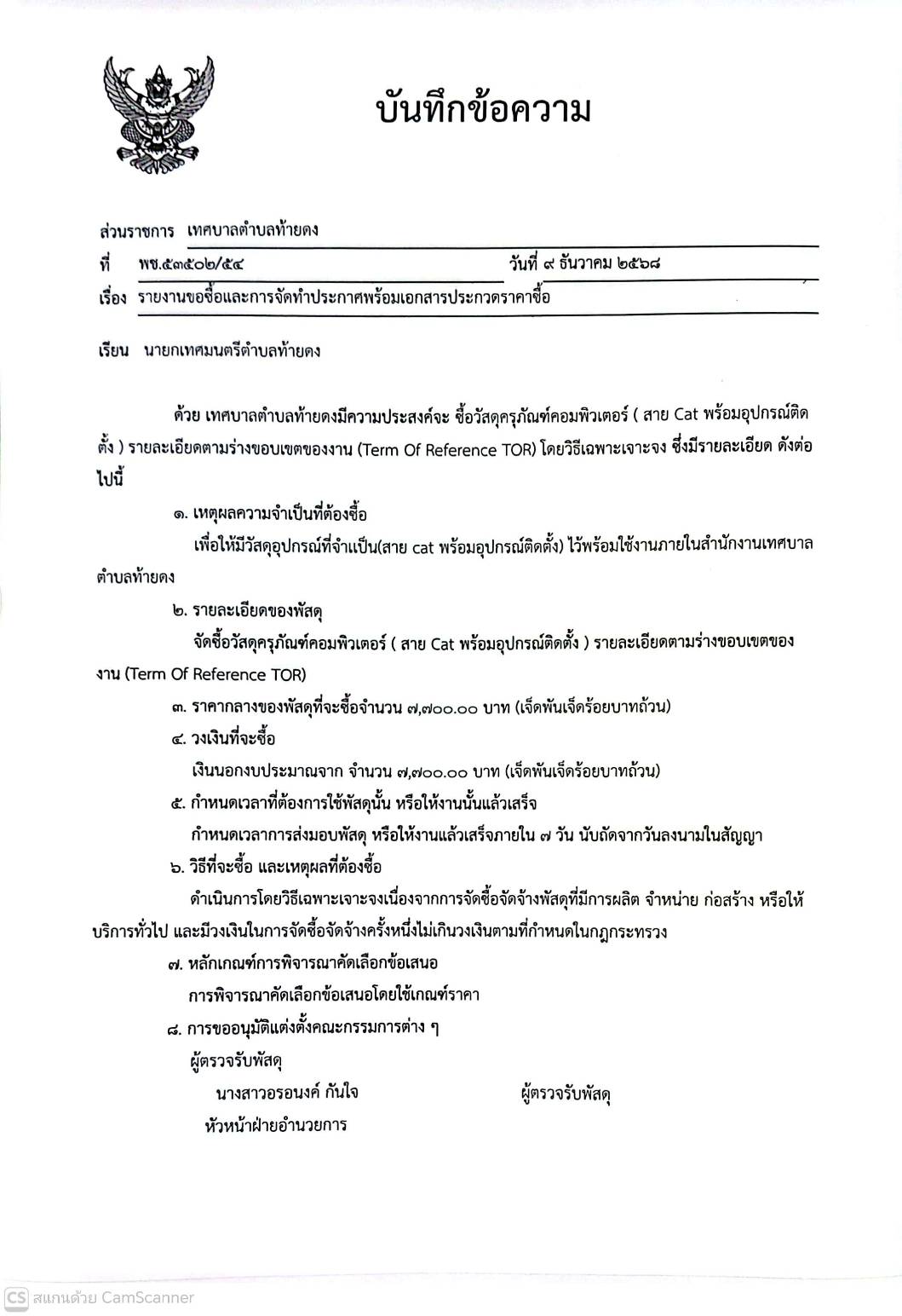 รายงานขอซื้อและการจัดทำประกาศพร้อมเอกสารประกวดราคาซื้อ จัดซื้อวัสดุคอมพิวเตอร์ ( สาย Cat พร้อมอุปกรณ์ติดตั้ง ) รายละเอียดตามร่างขอบเขตของงาน (Term Of Reference TOR)