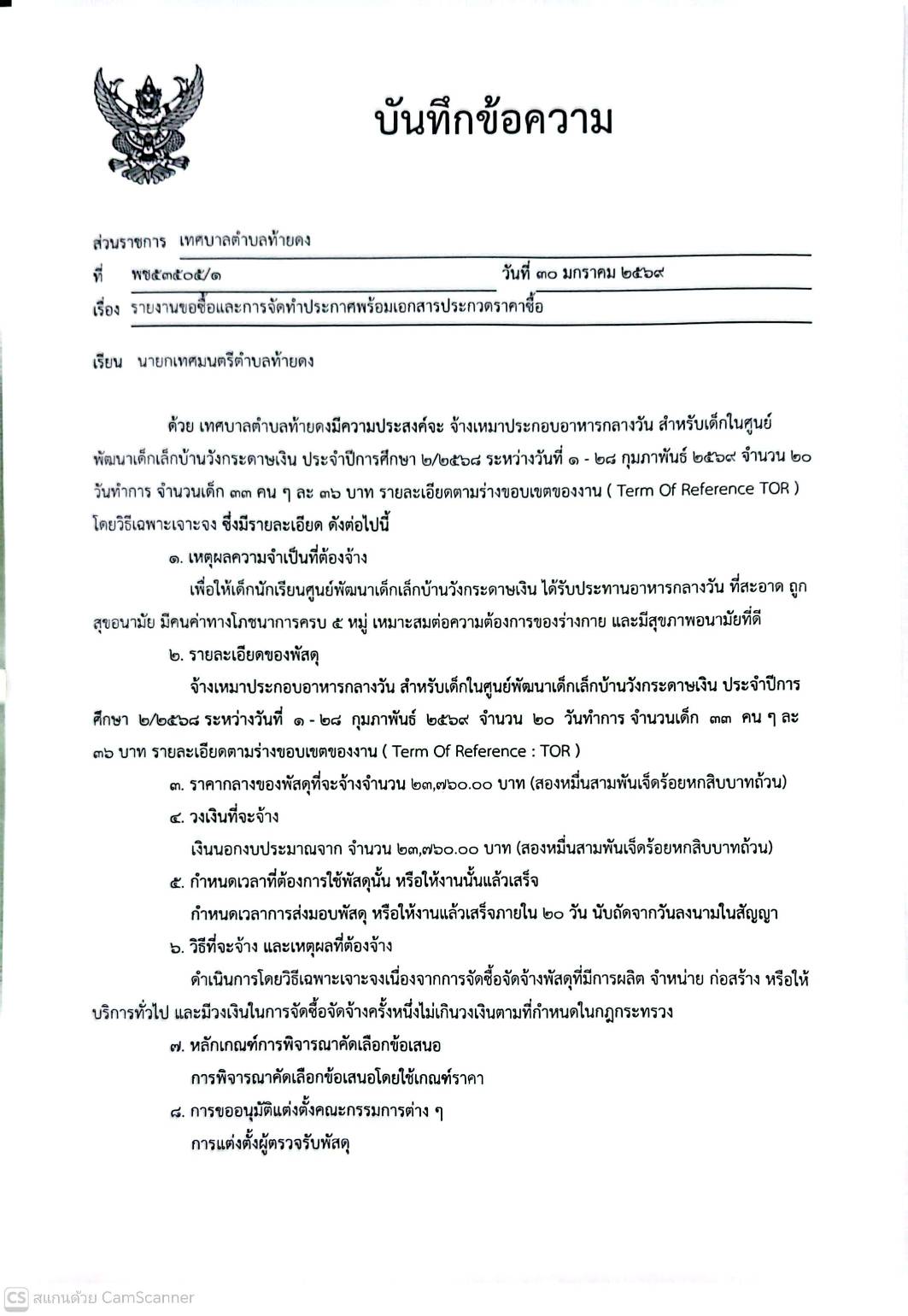 รายงานขอซื้อและการจัดทำประกาศพร้อมเอกสารประกวดราคาซื้อ จ้างเหมาประกอบอาหารกลางวันสำหรับเด็กในศูนย์พัฒนาเด็กเล็กบ้านวังกระดาษเงิน ประจำปีการศึกษา 2/2568 ระหว่างวันที่ 1-28 กุมภาพันธ์ 2569 จำนวน 20 วันทำการ จำนวนเด็กนักเรียน 33 คนๆละ 33 บาท รายละเอียดตามร่า
