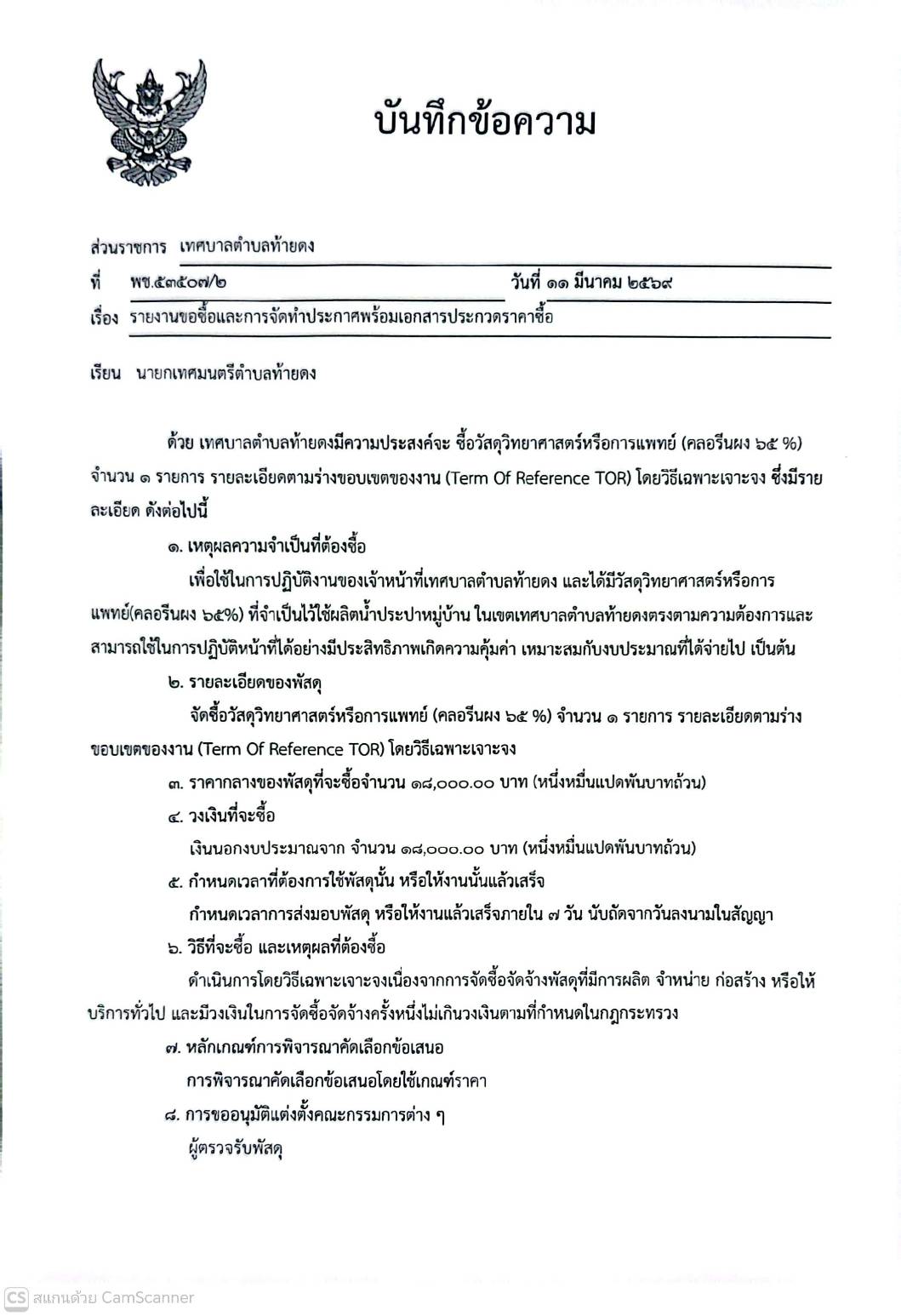 รายงานขอซื้อและการจัดทำประกาศพร้อมเอกสารประกวดราคาซื้อ จัดซื้อวัสดุวิทยาศาสตร์หรือการแพทย์(คลอรีนผง 65%) จำนวน 1 รายการ