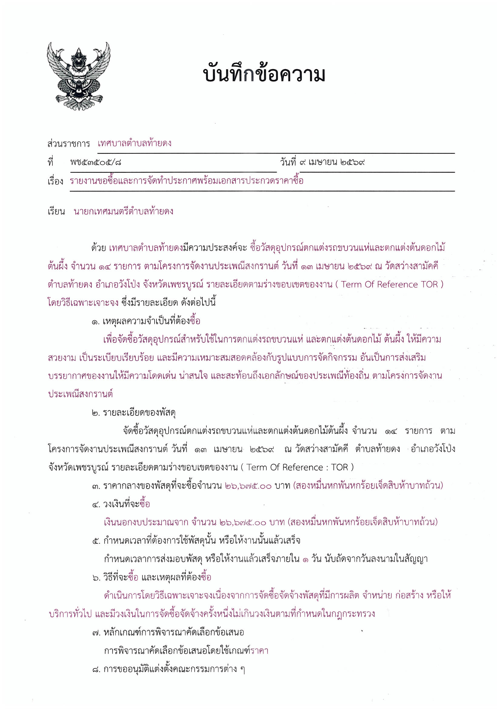 รายงานขอซื้อและการจัดทำประกาศพร้อมเอกสารประกวดราคาซื้อวัสดุอุปกรณ์ตกแต่งรถขบวนแห่และตกแต่งต้นดอกไม้ต้นผึ้ง ตามโครงการจัดงานประเพณีสงกรานต์ วันที่ 13 เมษายน 2569 ณ วัดสว่างสามัคคี