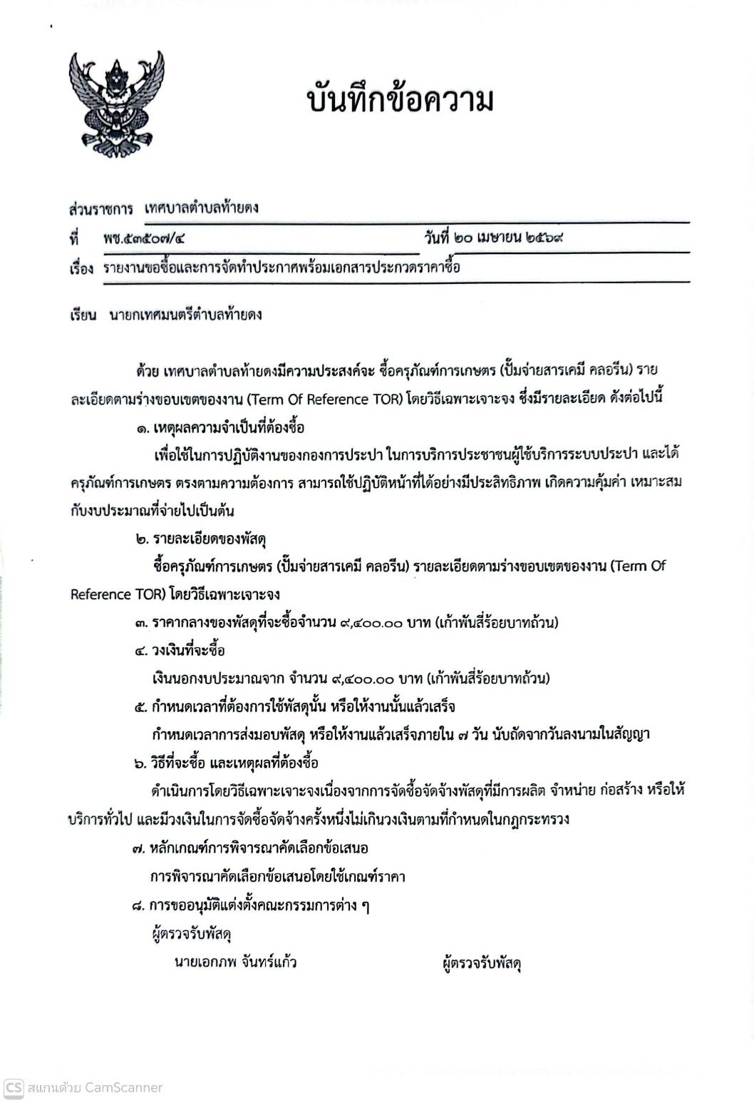 รายงานขอซื้อและการจัดทำประกาศพร้อมเอกสารประกวดราคาซื้อ ซื้อจัดซื้อครุภัณฑ์การเกษตร (ปั๊มจ่ายสารเคมี คลอรีน) จำนวน 1 รายการ