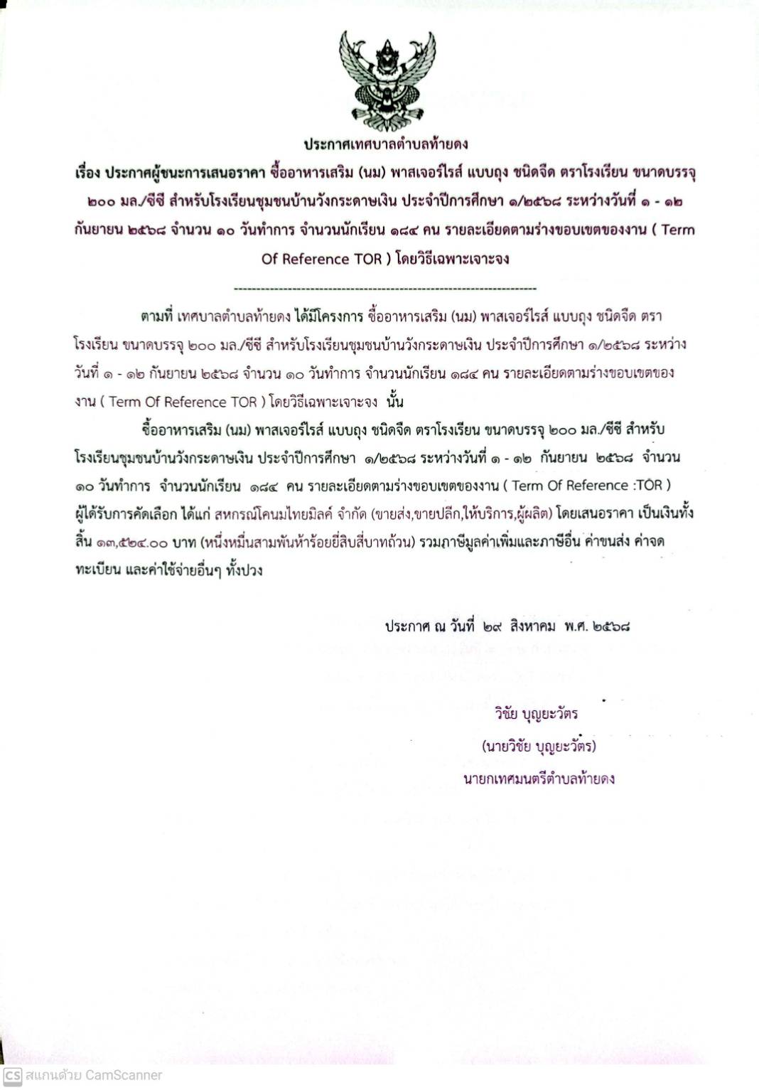 ประกาศผู้ชนะการเสนอราคา จัดซื้ออาหารเสริม(นม) พาสเจอร์ไรส์ แบบถุง ชนิดจืด ตราโรงเรียน ขนาดบรรจุ 200 มล./ซีซี สำหรับโรงเรียนชุมชนบ้านวังกระดาษเงิน ประจำปีการศึกษาที่ 1/2568 ระหว่างวันที่ 1 - 12 กันยายน 2568 จำนวน 10 วันทำการ จำนวนเด็กนักเรียน 184 คน รายละเ