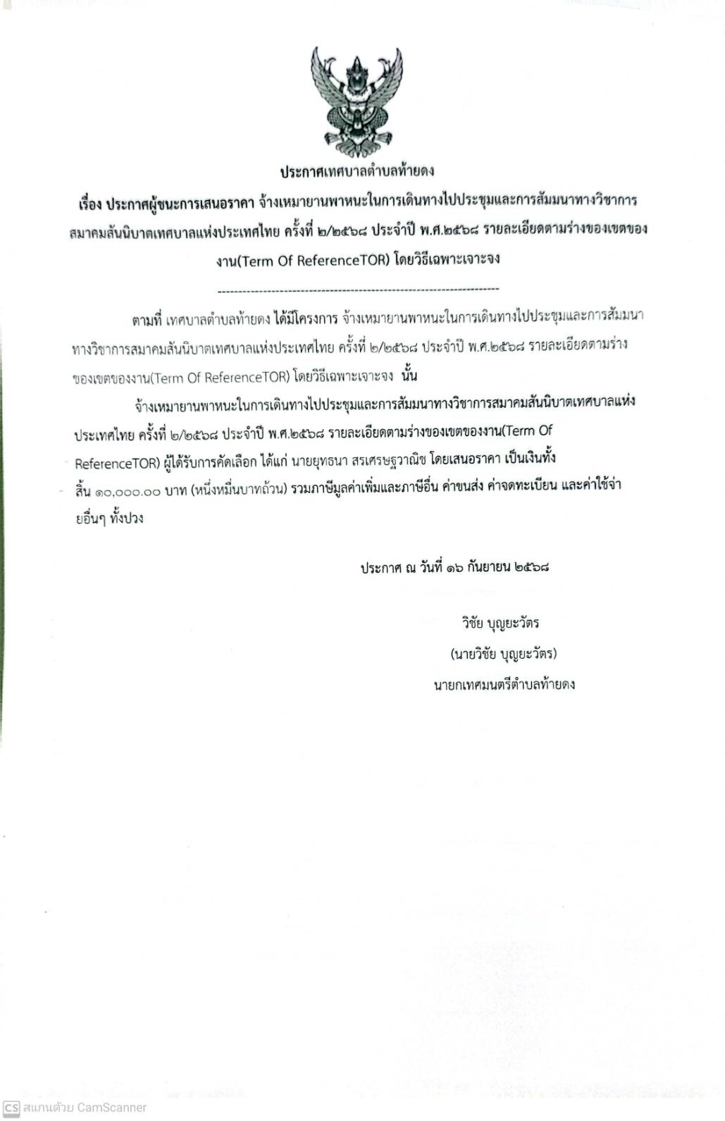 ประกาศผู้ชนะราคา ประจำปีงบประมาณ 2568