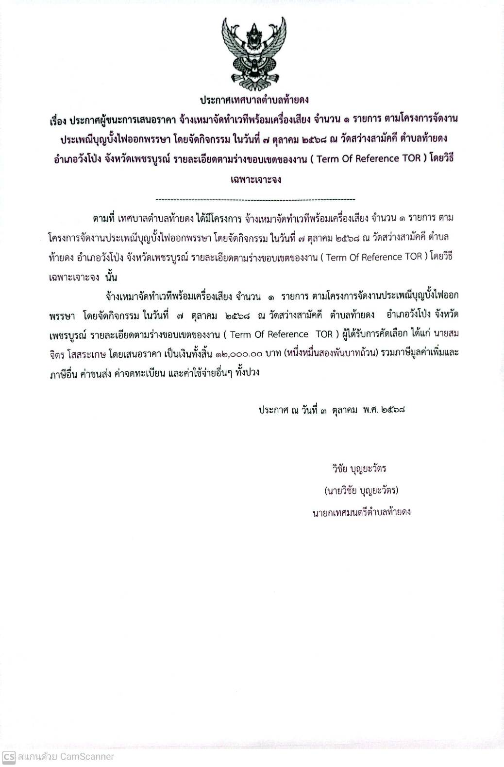 ประกาศผู้ชนะการเสนอราคา จ้างเหมาจัดทำเวทีพร้อมเครื่องดื่ม ตามโครงการจัดงานประเพณีบุญบั้งไฟออกพรรษา โดยจัดกิจกรรม ในวันที่ 7 ตุลาคม 2568 ณ วัดสว่างสามัคคี ตำบลท้ายดง อำเภอวังโป่ง จังหวัดเพชรบูรณ์ รายละเอียดตามร่างขอบเขตของงาน (Term Of Reference :TOR)
