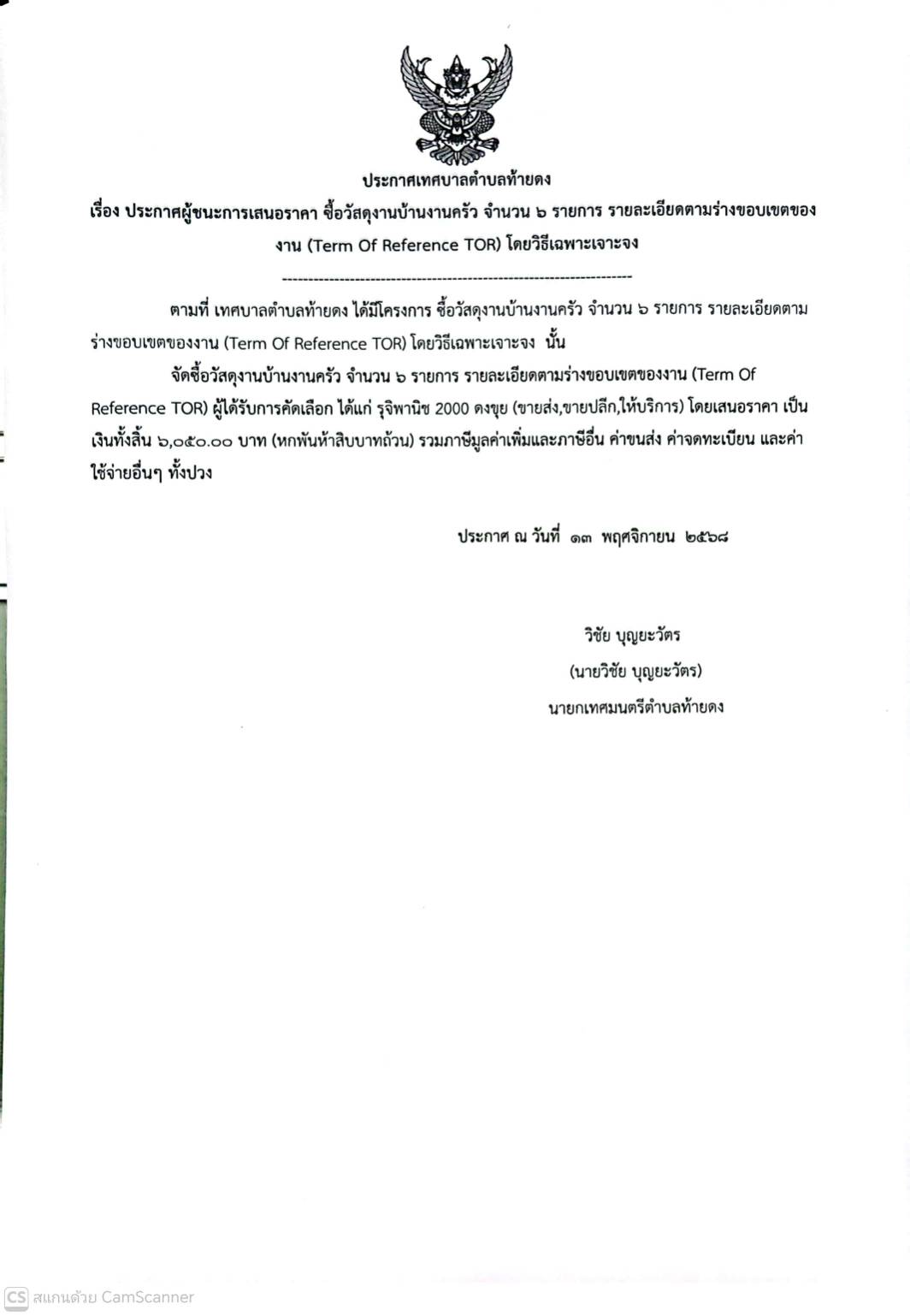 ประกาศผู้ชนะการเสนอราคา จัดซื้อวัสดุงานบ้านงานครัว จำนวน 6 รายการ รายละเอียดตามร่างขอบเขตของงาน (Term Of Reference :TOR)