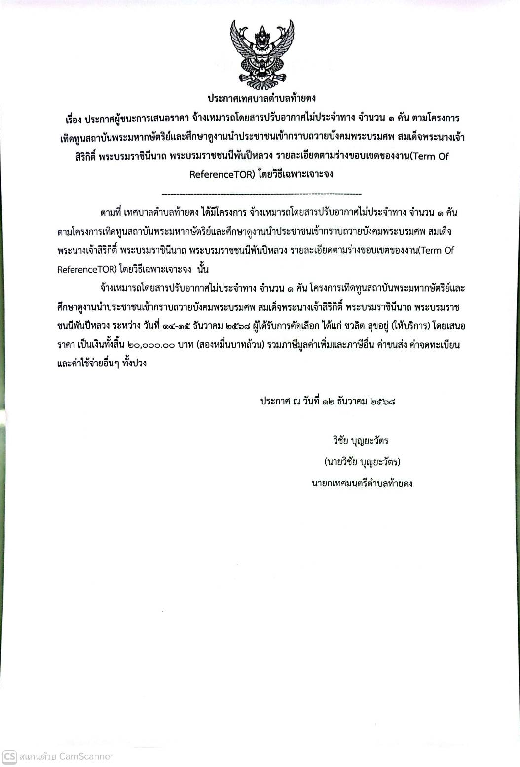 ประกาศผู้ชนะการเสนอราคา จ้างเหมารถโดยสารปรับอากาศไม่ประจำทาง จำนวน ๑ คัน ตามโครงการเทิดทูนสถาบันพระมหากษัตริย์และศึกษาดูงานนำประชาชนเข้ากราบถวายบังคมพระบรมศพ สมเด็จพระนางเจ้าสิริกิติ์ พระบรมราชินีนาถ พระบรมราชชนนีพันปีหลวง ระหว่างวันที่ 14-15 ธันวาคม 2568
