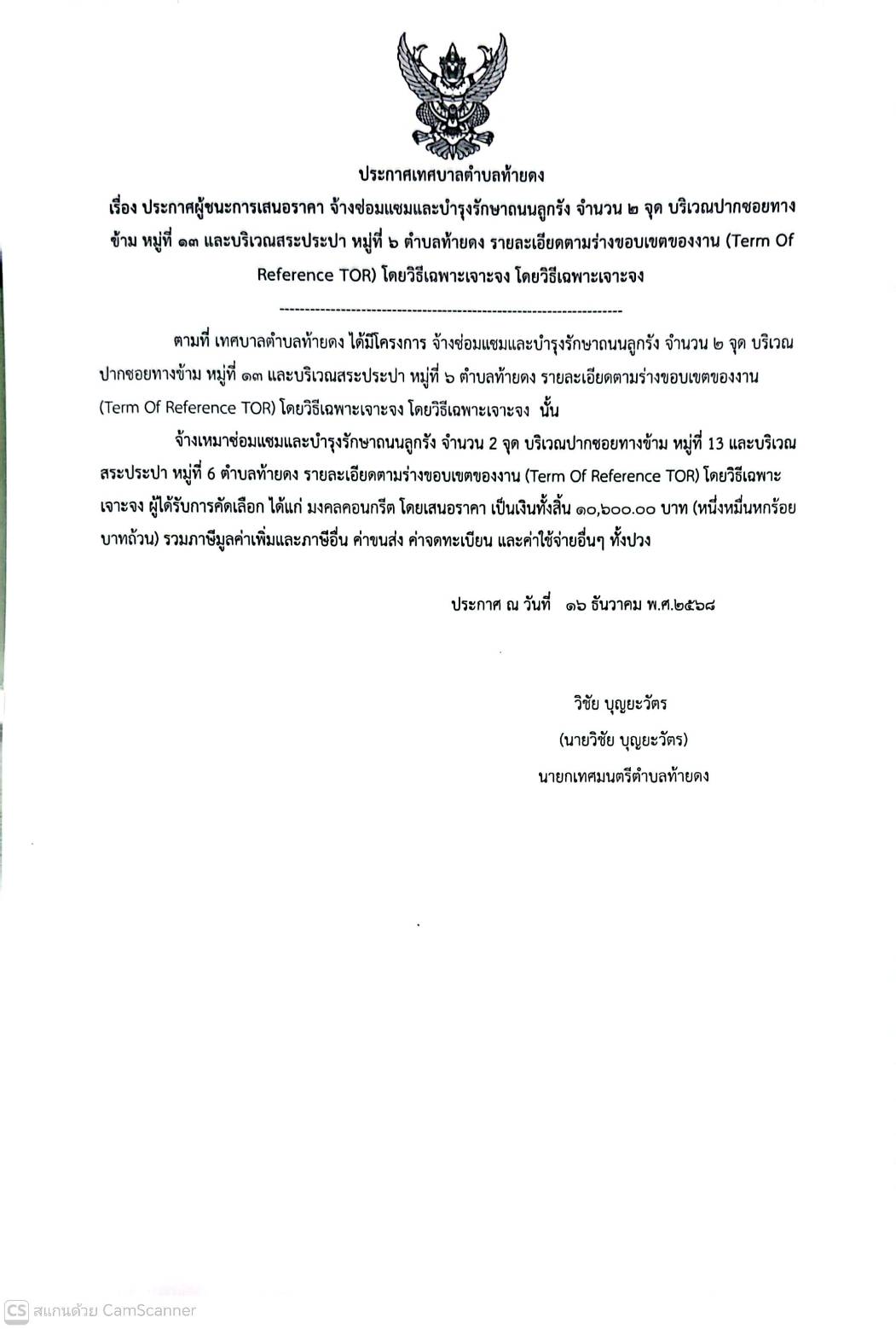 ประกาศผู้ชนะการเสนอราคา จ้างเหมาซ่อมแซมและบำรุงรักษาถนนลูกรัง จำนวน 2 จุด บริเวณปากซอยทางข้าม หมู่ที่ 13 และบริเวณสระประปา หมู่ที่ 6 ตำบลท้ายดง รายละเอียดตามร่างขอบเขตของงาน (Term Of Reference :TOR)