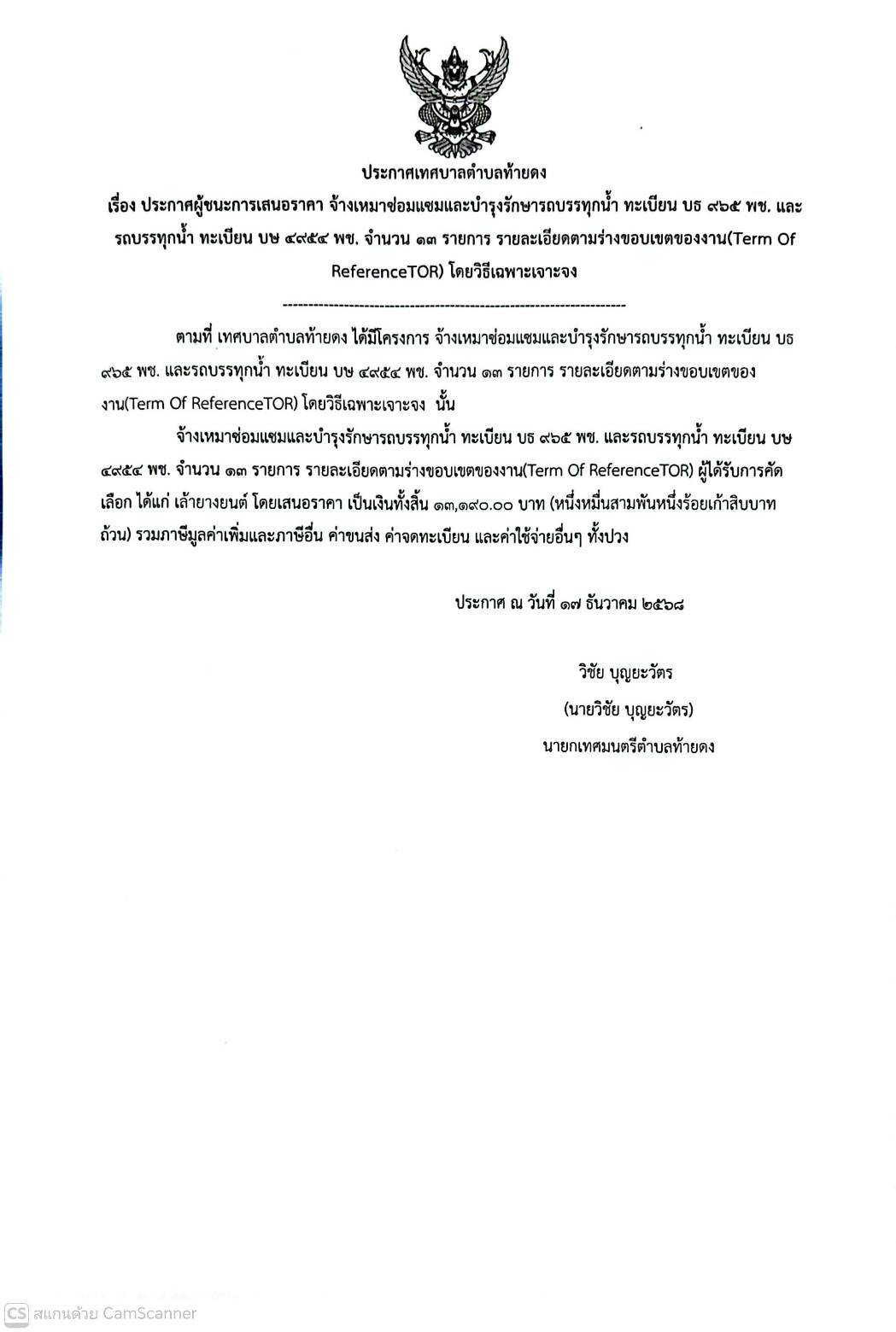 ประกาศผู้ชนะการเสนอราคา จ้างเหมาซ่อมแซมและบำรุงรัษารถบรรทุกน้ำ ทะเบียน บธ 965 พช. และทะเบียน บษ 4954 พช. จำนวน 13 รายการ รายละเอียดตามร่างขอบเขตของงาน (Term Of Reference :TOR)