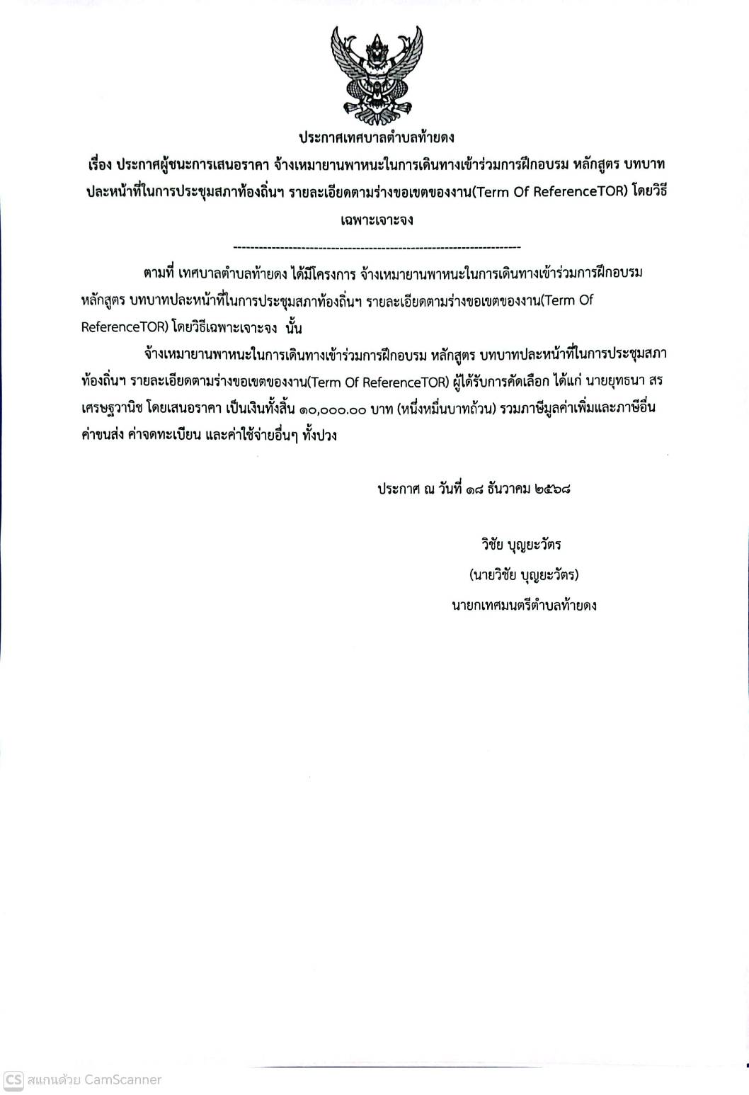 ประกาศผู้ชนะราคา ประจำปีงบประมาณ 2568
