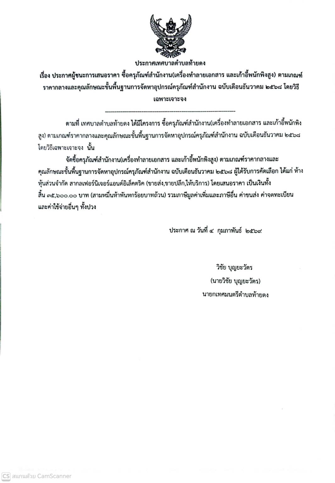 ประกาศผู้ชนะราคา ประจำปีงบประมาณ 2569