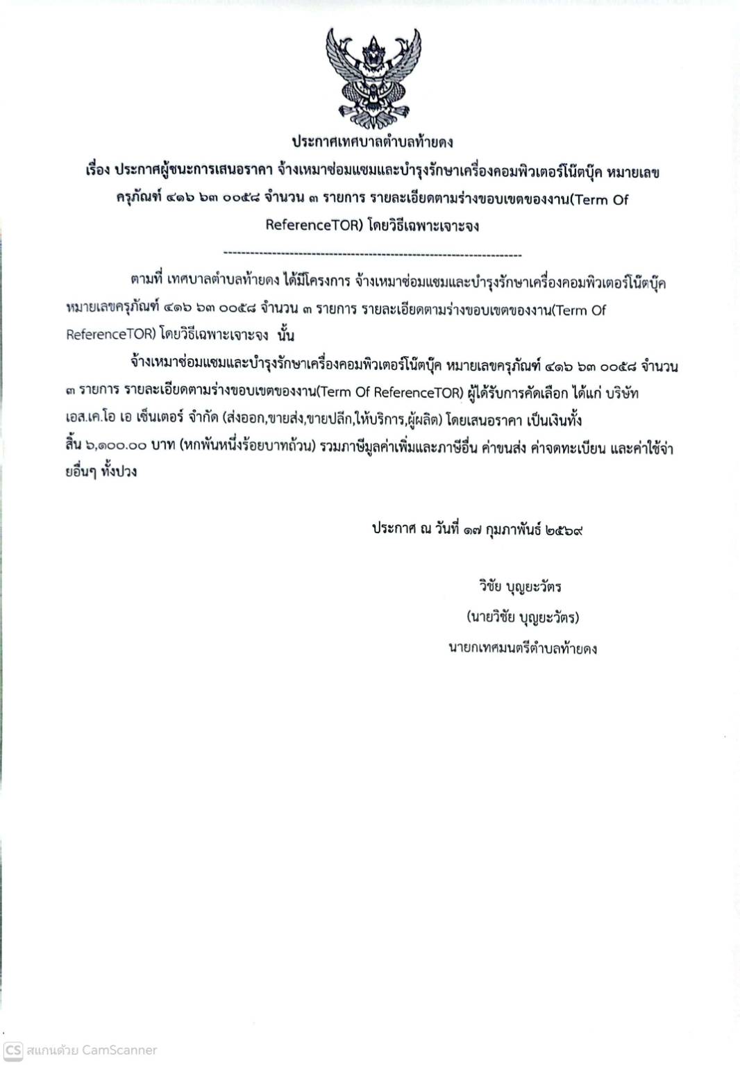 ประกาศผู้ชนะการเสนอราคา จ้างเหมาซ่อมแซมและบำรุงรักษาเครื่องคอมพิวเตอร์โน๊ตบุ๊ค หมายเลขครุภัณฑ์ 416 63 0058 จำนวน 3 รายการ รายละเอียดตามร่างขอบเขตของงาน (Term Of Reference :TOR)