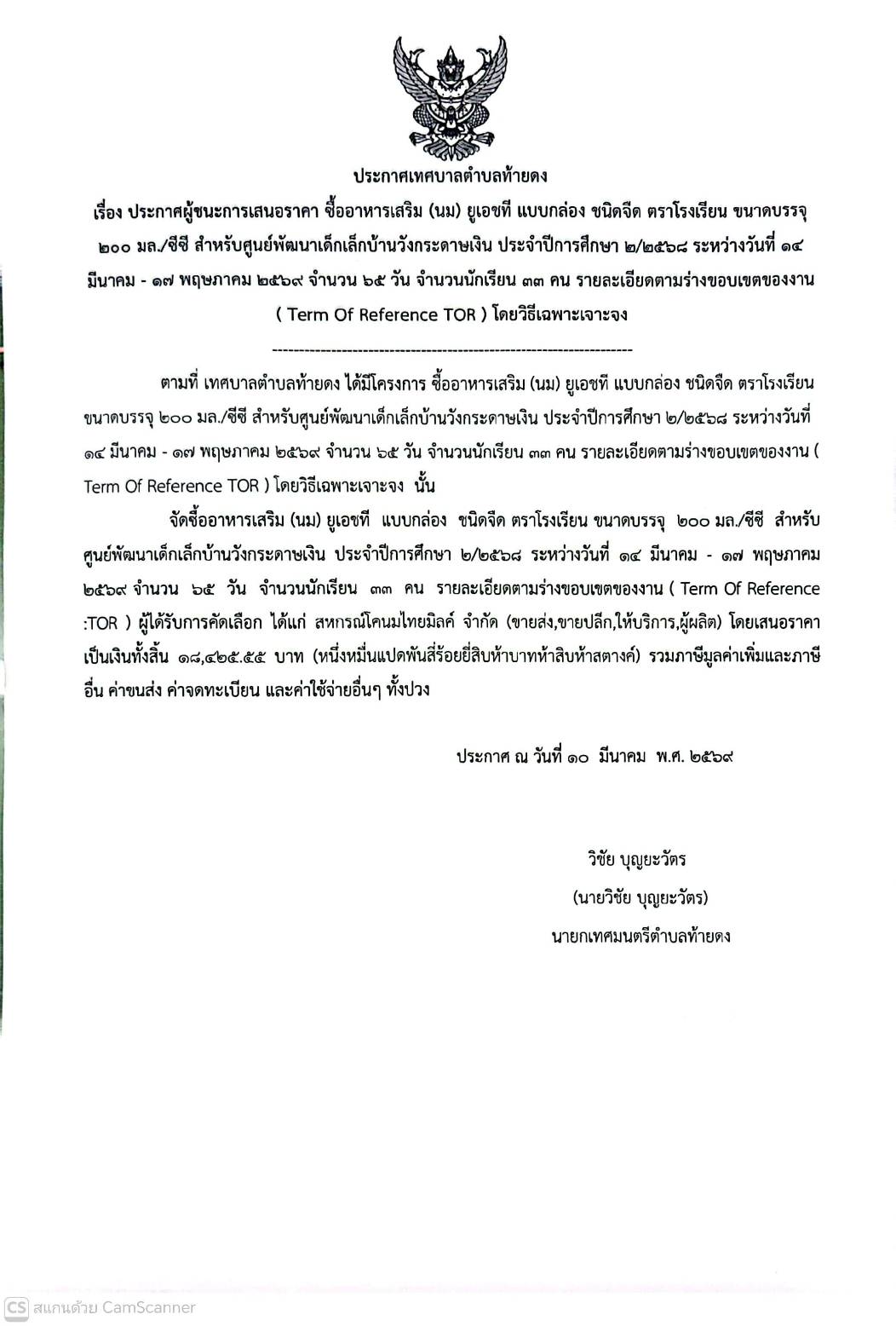 ประกาศผู้ชนะการเสนอราคา จัดซื้ออาหารเสริม(นม) ยูเอชที แบบกล่อง ชนิดจืด ตราโรงเรียน ขนาดบรรจุ 200 มล./ซีซี สำหรับศูนย์พัฒนาเด็กเล็กบ้านวังกระดาษเงิน ประจำปีการศึกษาที่ 2/2568 ระหว่างวันที่ 14 มีนาคม - 17 พฤษภาคม 2569 จำนวน 65 วัน จำนวนเด็กนักเรียน 33 คน